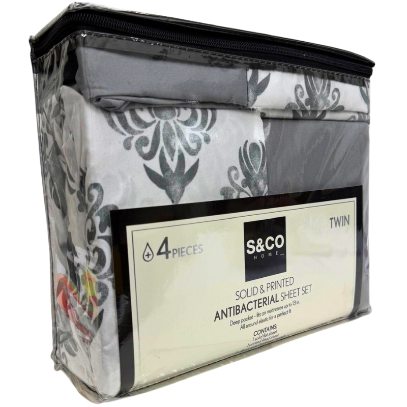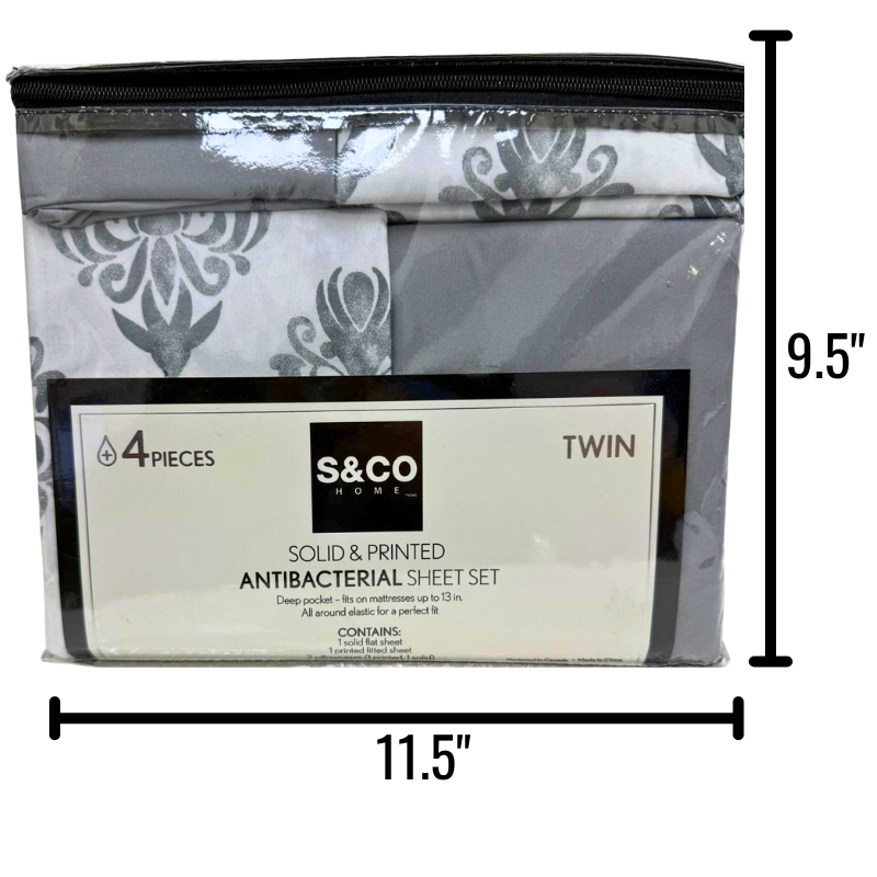 - DESCRIPTION: 4-piece twin sheet set in grey, available in solid or printed styles. Includes fitted sheet, flat sheet, and two pillowcases. Soft, durable, and antibacterial—perfect for shelters, community housing, or hygiene-focused donation programs.
