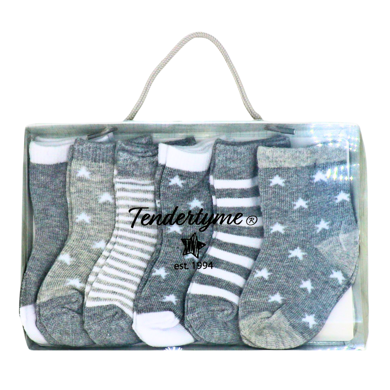 - DESCRIPTION: Six soft and stretchy socks in coordinating grey star and stripe patterns, designed to fit infants aged 6–12 months. A cozy essential for baby bundles, family care kits, or donation programs supporting infant needs.
