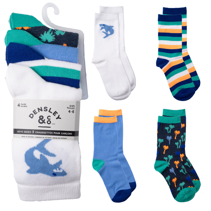 - DESCRIPTION: Four-pack of boys’ crew socks in assorted colours, size 4–6. Made with soft, flexible fabric for comfort and durability, perfect for daily wear or school use. A practical option for children’s essentials programs and family support initiatives.