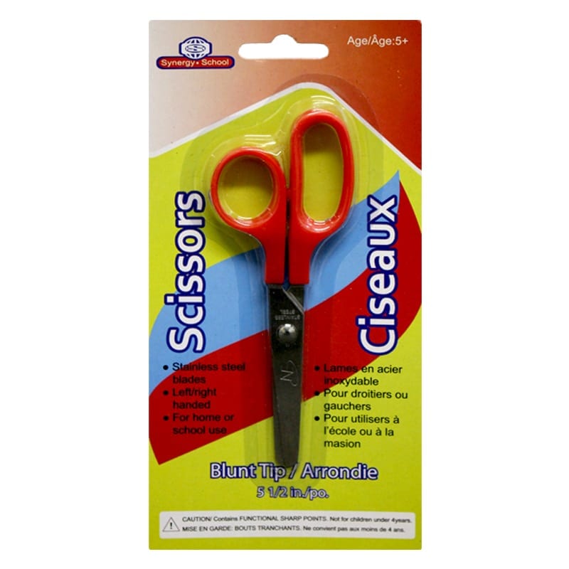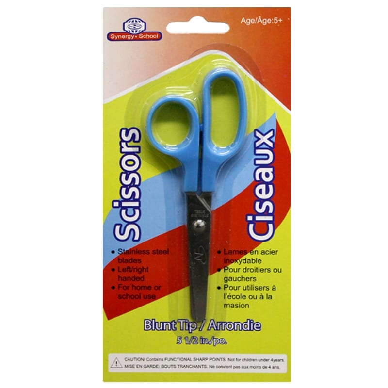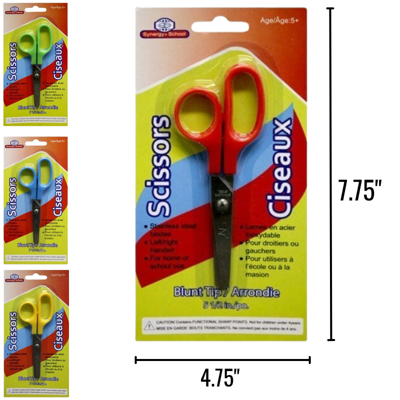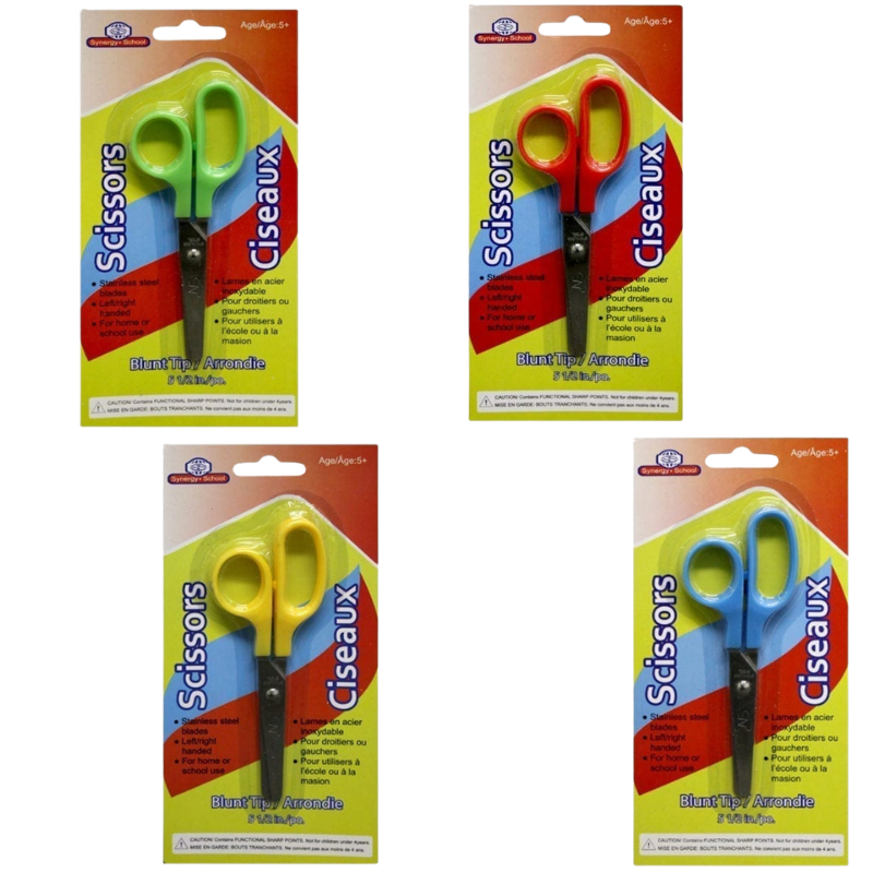 - DESCRIPTION: Safety scissors with blunt tips measuring 5.5 inches, available in four assorted colours. Designed for safe and easy cutting with a comfortable grip suitable for children and everyday use. A practical stationery essential for school, crafts, or general use.