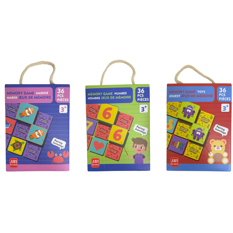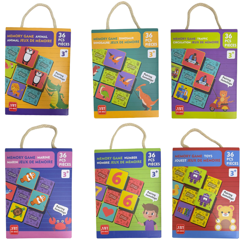 - DESCRIPTION: 36-piece memory game set available in six assorted themes including animals, marine, toys, numbers, dinosaurs, and traffic. Designed to support memory and matching skills through interactive play. A fun and engaging activity suitable for children, classrooms, or group use.