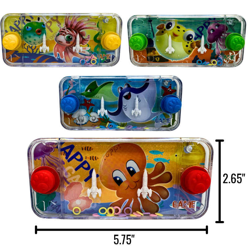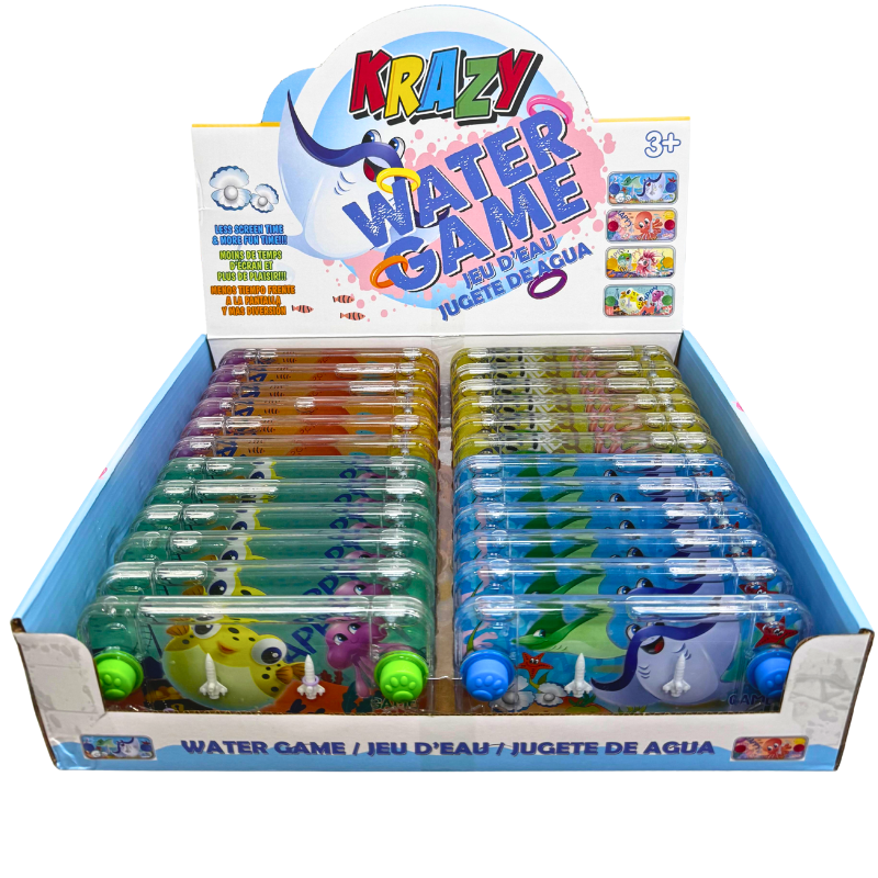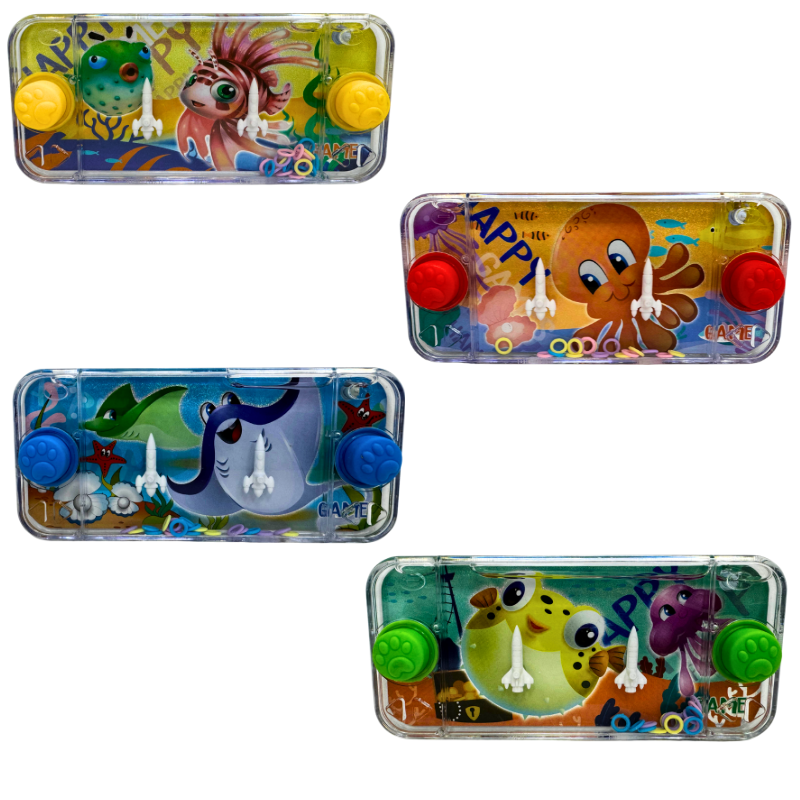 - DESCRIPTION: Handheld mini water game with fun aquatic designs. Compact and easy to play, offering simple push-button entertainment that helps develop focus and coordination. Great for travel, party favours, or kids’ activity packs.