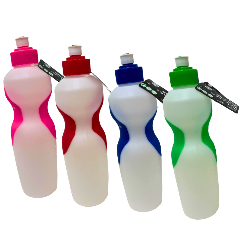 - DESCRIPTION: Sport water bottle with a 22 oz capacity, available in assorted colours. Designed with a soft-grip exterior for comfortable handling and easy use during activities or daily hydration. A practical reusable bottle suitable for sports, work, school, or on-the-go use.