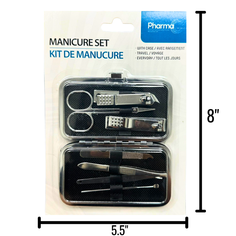 - DESCRIPTION: Manicure set in a compact case—includes essential grooming tools for nail care on the go. Ideal for hygiene kits, travel, or donation programs focused on personal wellness. Set Includes 7 nail care tools including hand and toe nail clippers all in a secure and handy travel case.