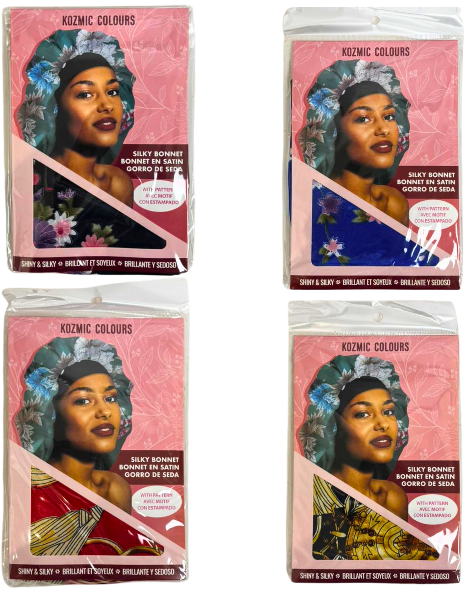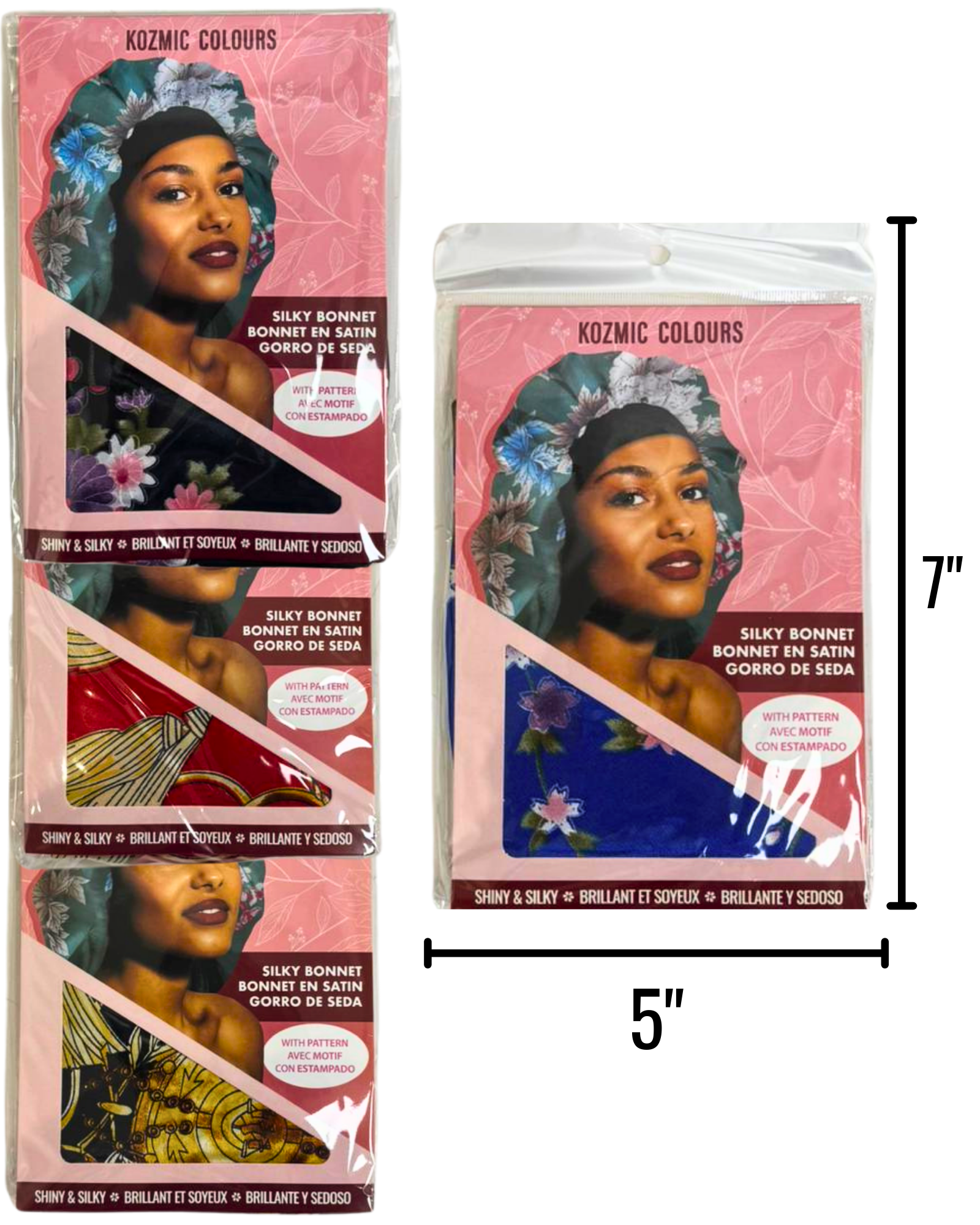- DESCRIPTION: Soft, smooth, and designed to protect your hair while you sleep, this silky bonnet comes in a variety of eye-catching patterns. The gentle fabric reduces friction to help maintain curls, braids, and styled hair without frizz. Comfortable enough for nightly use and stylish enough for travel or self-care kits, it’s a simple way to keep hair looking its best.