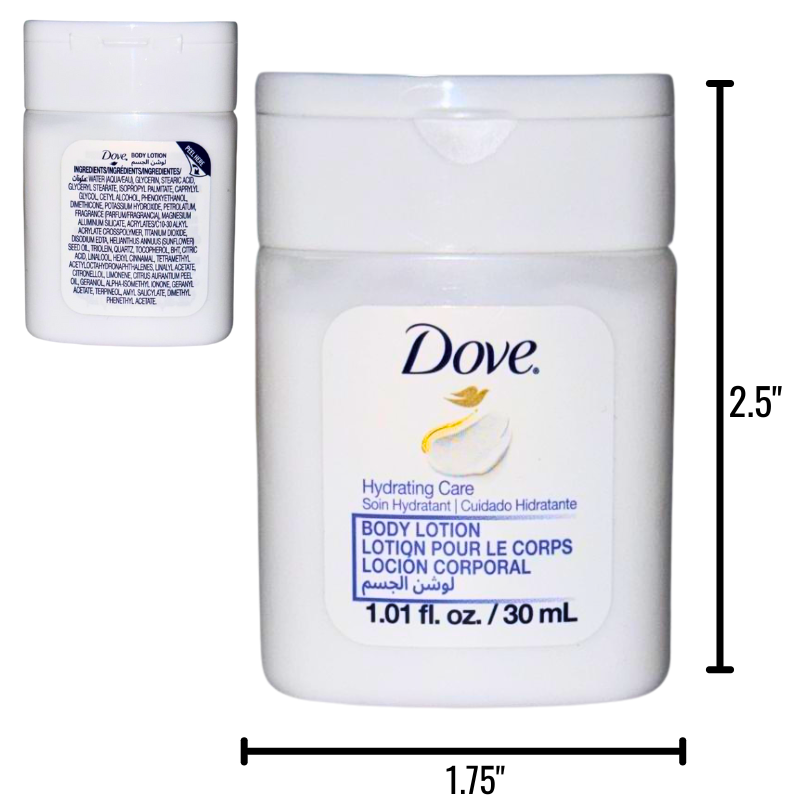 - DESCRIPTION: Dove hydrating body lotion in a convenient 30ml size, formulated to nourish and soften skin. Perfect for travel, hygiene kits, or inclusion in wellness and community care programs.
