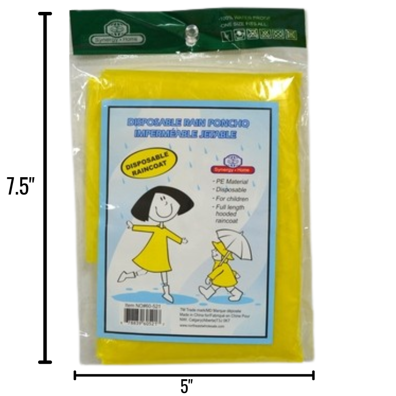- DESCRIPTION: Children’s disposable rain poncho—lightweight, compact, and easy to carry. Provides quick protection from the elements, making it ideal for school trips, outdoor events, or emergency and donation kits.