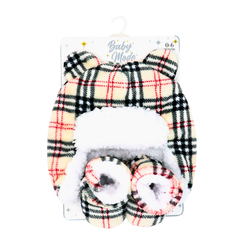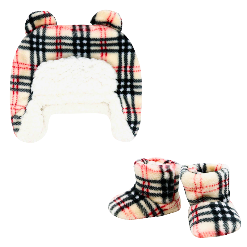 - DESCRIPTION: Cozy and adorable winter set featuring a soft hat and matching booties in a classic tan plaid pattern. Designed for infants aged 0–6 months, this set is perfect for baby bundles, winter care kits, or family support programs focused on keeping little ones warm.