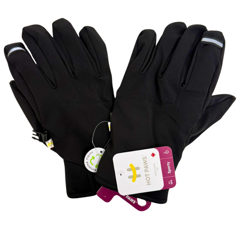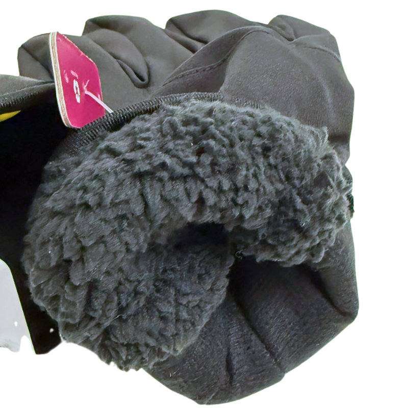 - DESCRIPTION: Pair of adult winter sport gloves in black, available in sizes S–XL. Made with a warm sherpa-lined interior to help insulate hands in cold-weather conditions while maintaining comfort and flexibility. Features touchscreen-compatible fingertips for convenient device use without removing gloves. A practical cold-weather essential designed for everyday wear and outdoor use.