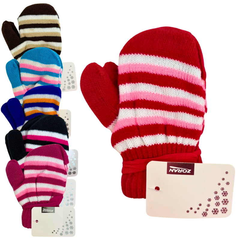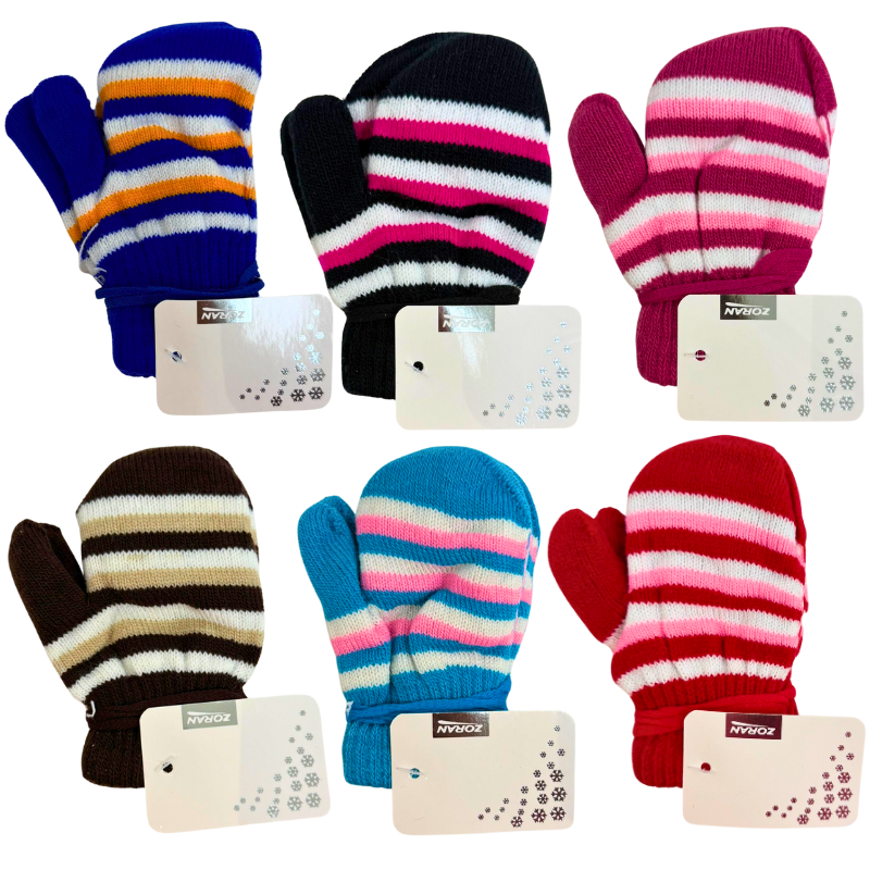 - DESCRIPTION: Soft and cozy knit mittens in fun assorted stripe designs, sized for toddlers. Perfect for keeping little hands warm during colder months—ideal for winter kits, family support programs, or donation bundles. NOTE: Mittens come with a connector string to keep mittens secure in the child’s jacket. These strings can easily be cut off once purchased if you prefer as some childcare facilities do not permit strings.