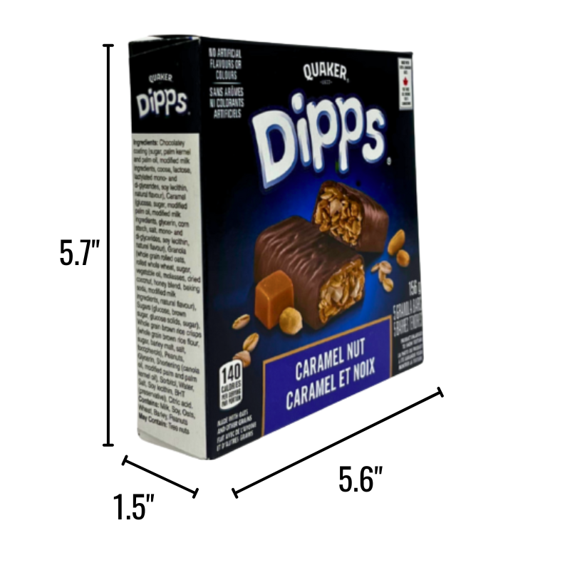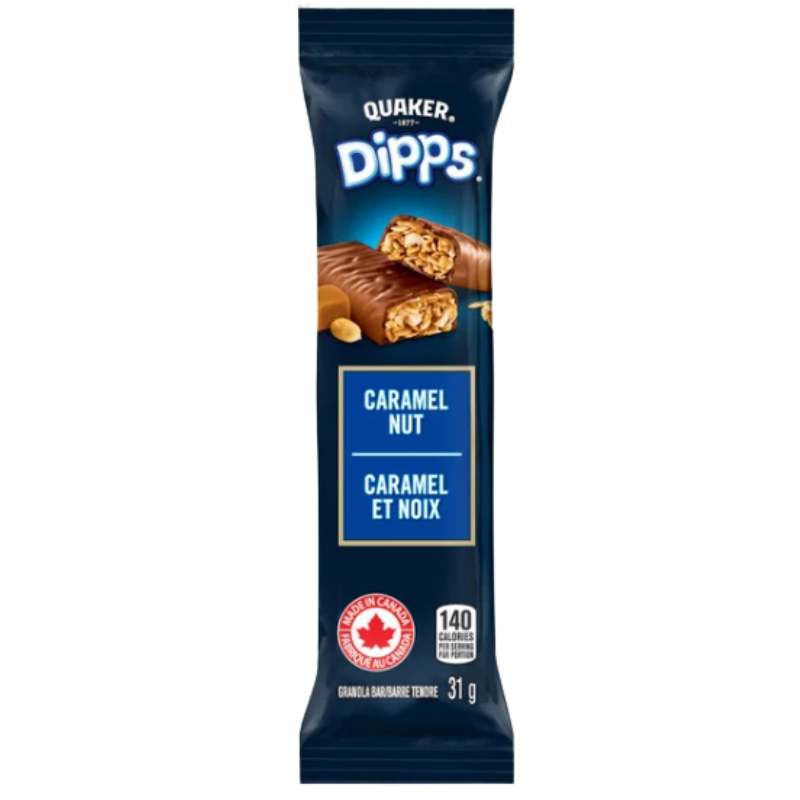 DETAILS: Satisfy your cravings with the rich, nutty goodness of Quaker Dipps Caramel Nut granola bars. Made with 100% Canadian oats and a blend of other wholesome grains, these bars are coated in a smooth caramel layer and contain no artificial flavours or colours—perfect for lunch boxes, office snacks, or after-school fuel.