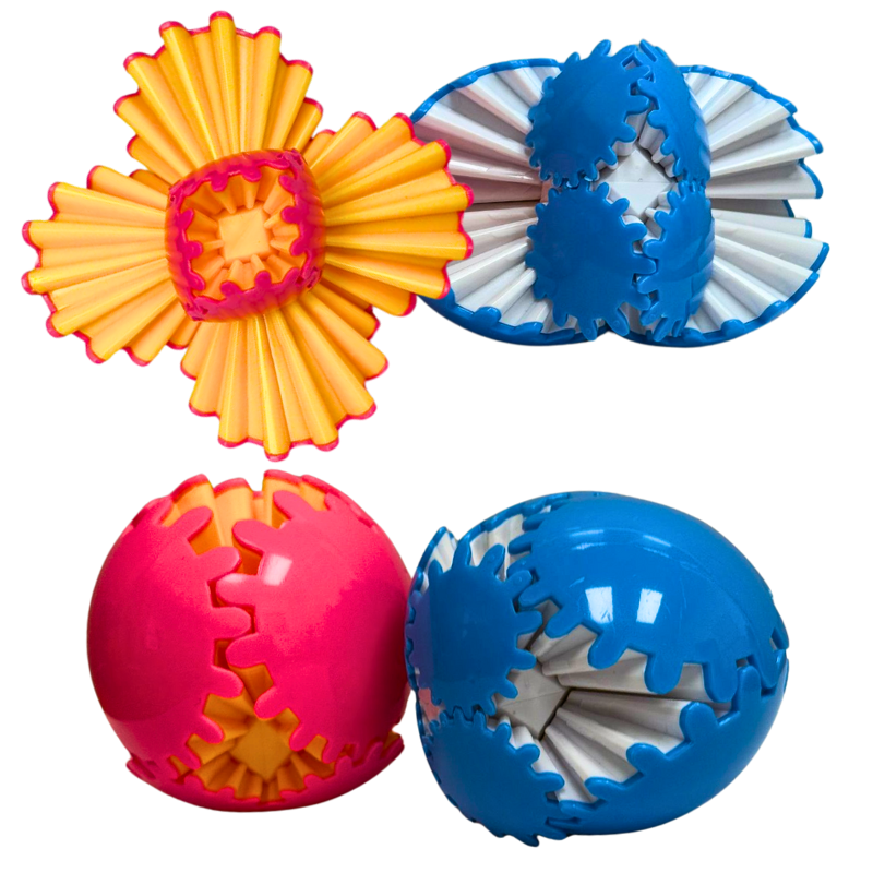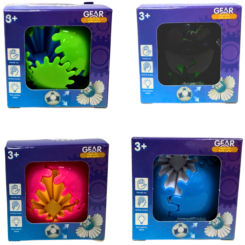 DESCRIPTION: Unique two-tone cube ball measuring 6.5 cm, available in assorted colors. Ball is made of spinning gear like parts that spin and make new shapes.