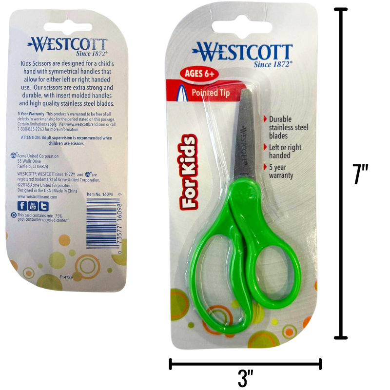 - DESCRIPTION: Westcott children’s scissors in neon green with a safe pointed tip, designed for school use and craft activities. Lightweight and durable, making them ideal for classrooms, art projects, or community supply programs.