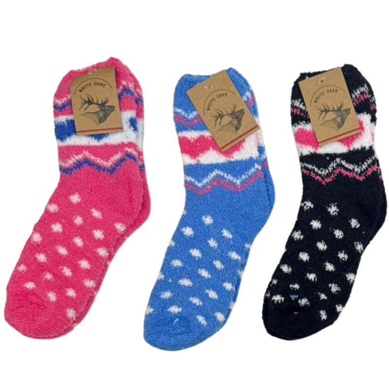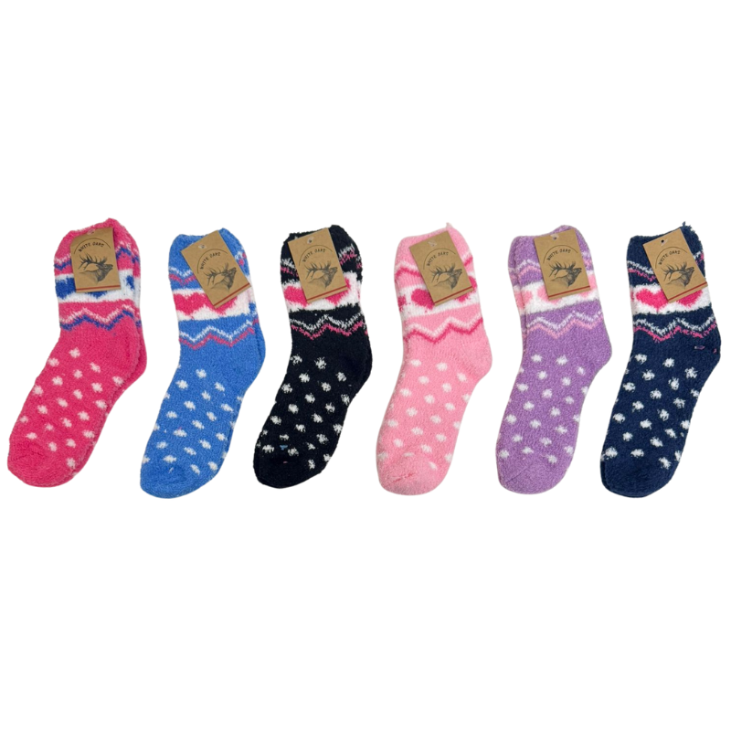 DESCRIPTION: Soft and ultra-cozy, these fluffy ladies’ socks feature a playful mix of polka dots and heart patterns in assorted colours. The plush fabric keeps feet warm and comfortable, making them perfect for lounging, relaxing, or slipping into winter boots. A fun and comfy pick for everyday cold-weather wear.